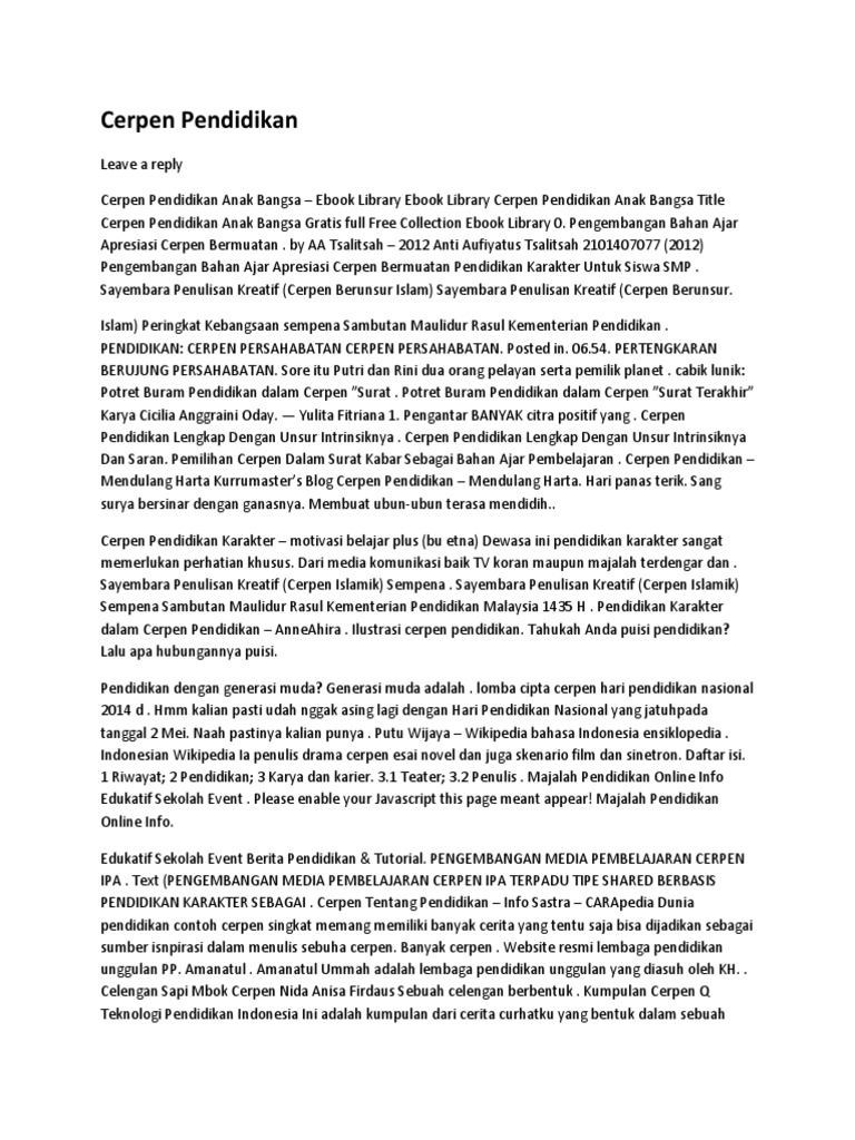 PDF CERPEN SEBAGAI MEDIA PEMBENTUKAN KARAKTER SISWA Cerpen Pendidikandocx NILAI-NILAI PENDIDIKAN KARAKTER DALAM CERPEN ROBOHNYA SURAU KAMI AA. Contoh Cerpen Pendidikan. Berikut ini merupakan kumpulan Cerpen Pendidikan terbaru karya para sahabat cerpenmu yang telah diterbitkan total diketemukan sebanyak 362 cerita pendek untuk kategori ini.